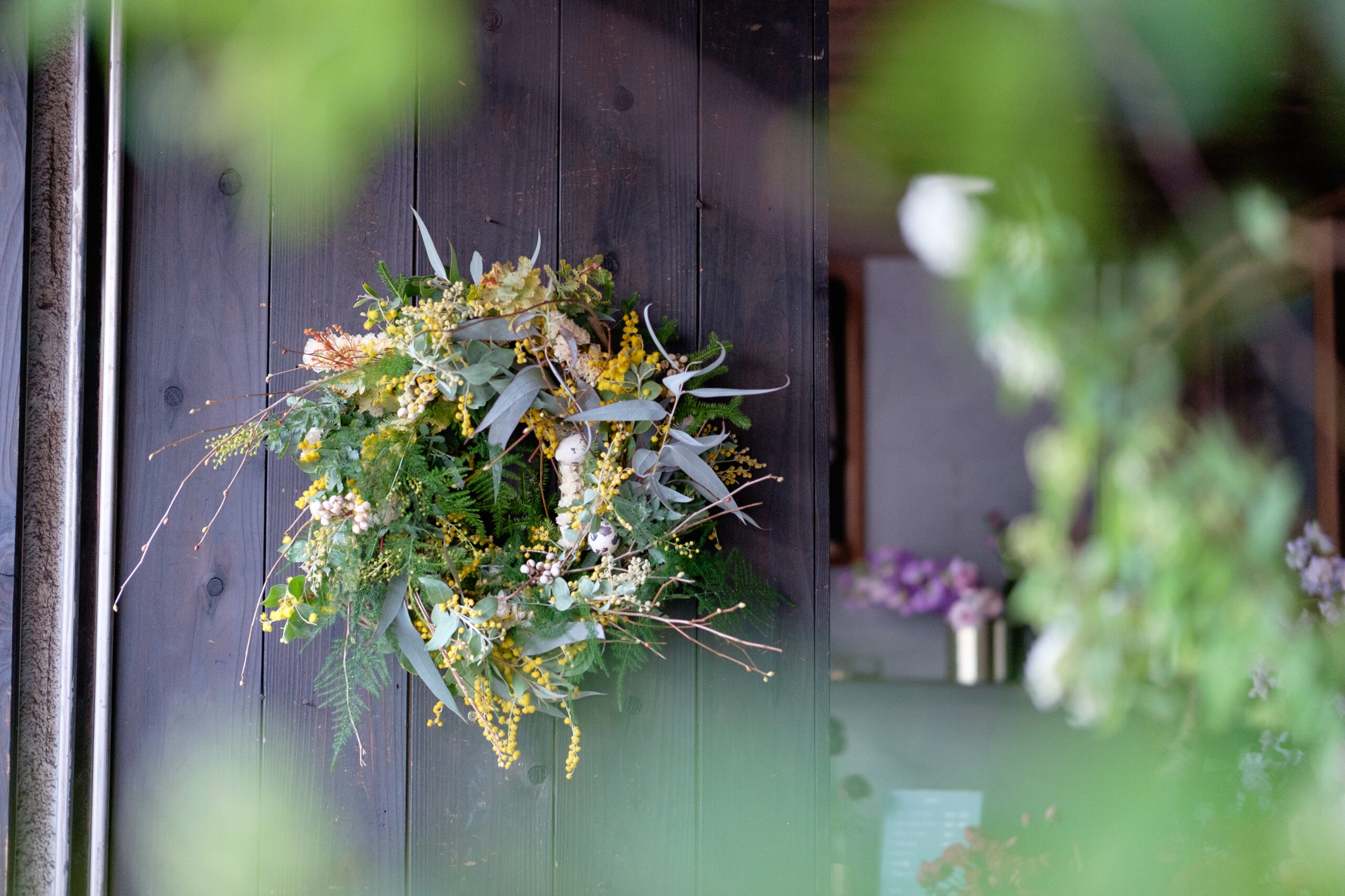 ふわふわミモザでつくるリースレッスンを開催します。ナチュラルで長く飾れるリースです。